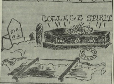 A striking example of this type of “grumbling” was a cartoon printed in a 1959 issue of The College Times depicting a coffin labelled “College Spirit” RIP 1956.”[2] It would seem (from the cartoonist's view, at least) that the enthusiasm, excitement, and commitment needed to generate school spirit or pride were lacking at PWC.